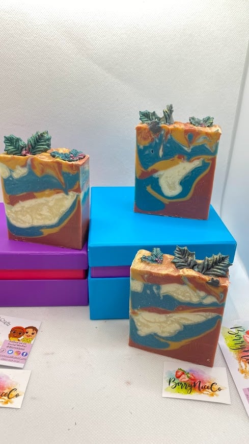 Ingredients; Olive oil, coconut oil, coffee grounds, Vitamin E Oil, Castor oil, sodium hydroxide, micas, fragrance oil, titanium Dioxide, activated charcoal, sodium lactate