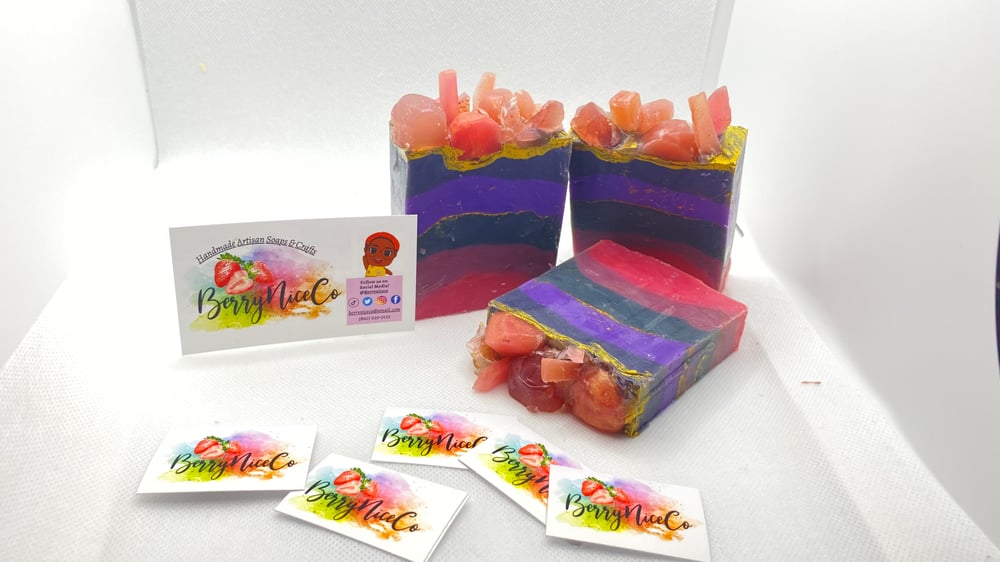 Ingredients; Olive oil, coconut oil, Castor oil, sodium hydroxide, micas, fragrance oil, titanium Dioxide, activated charcoal
