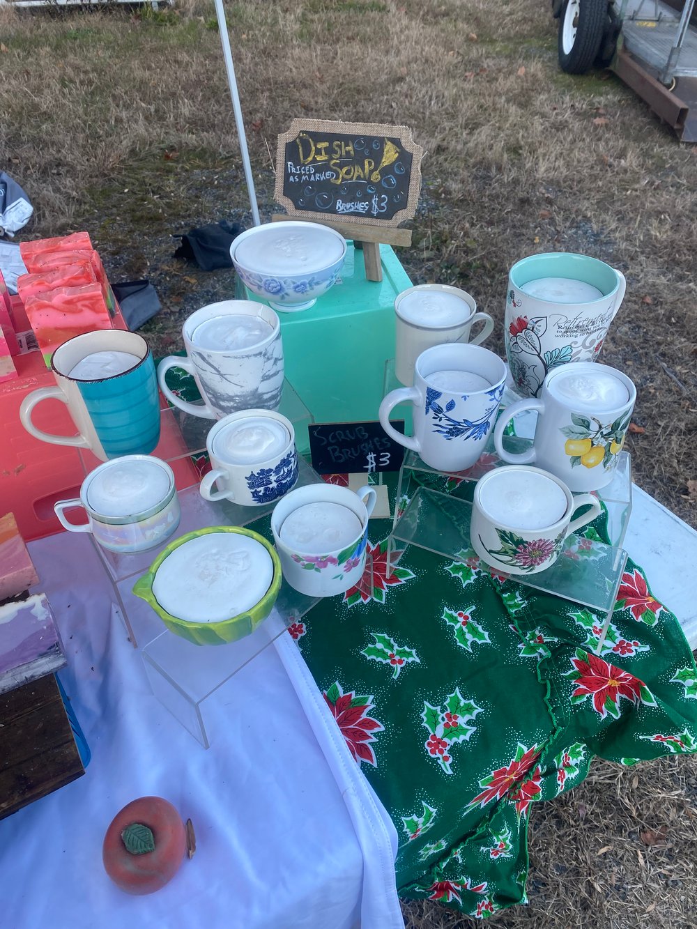 Vegan Lemon Scented Dish Soap. This is a solid bar of dish soap that has been poured into a hand picked ceramic dish.
